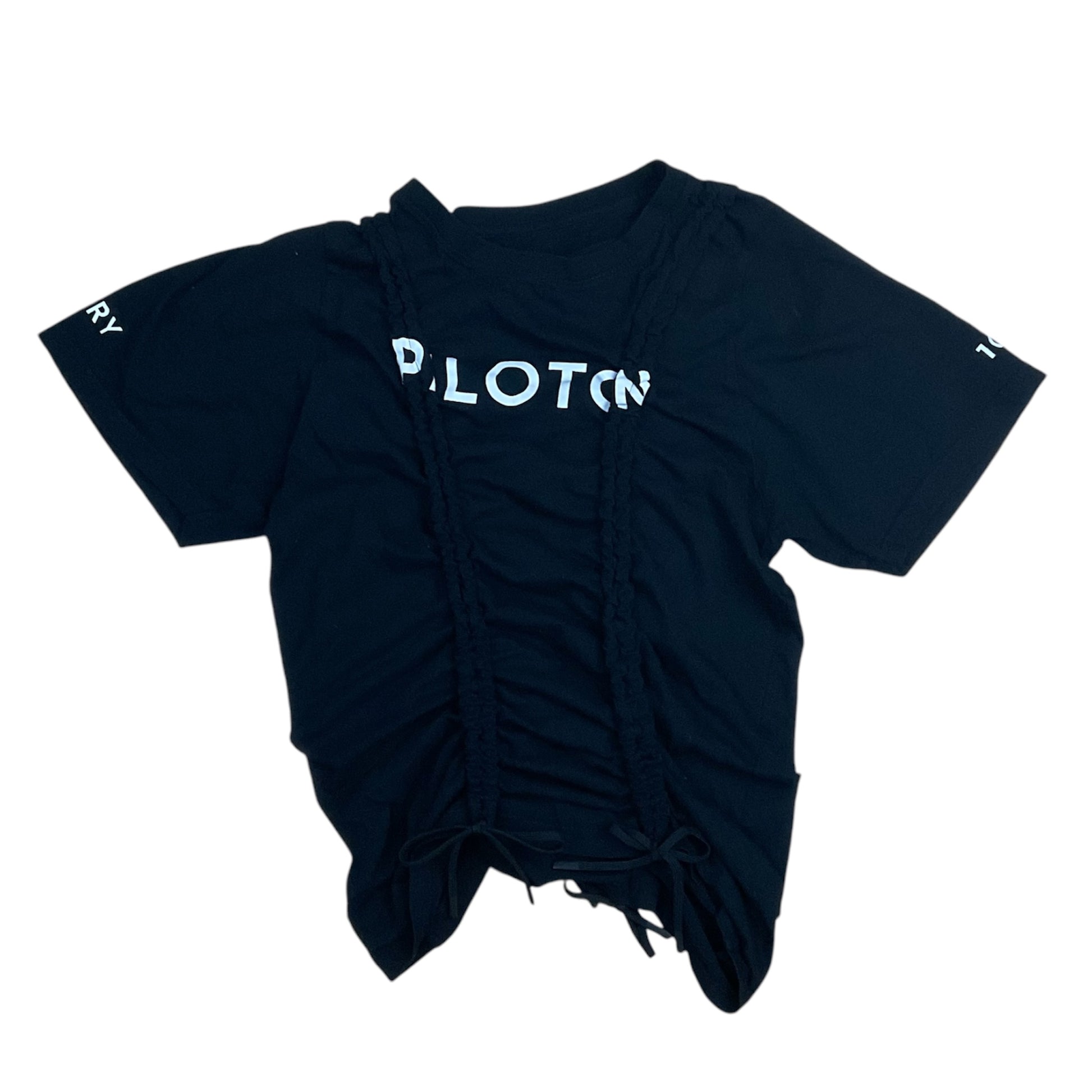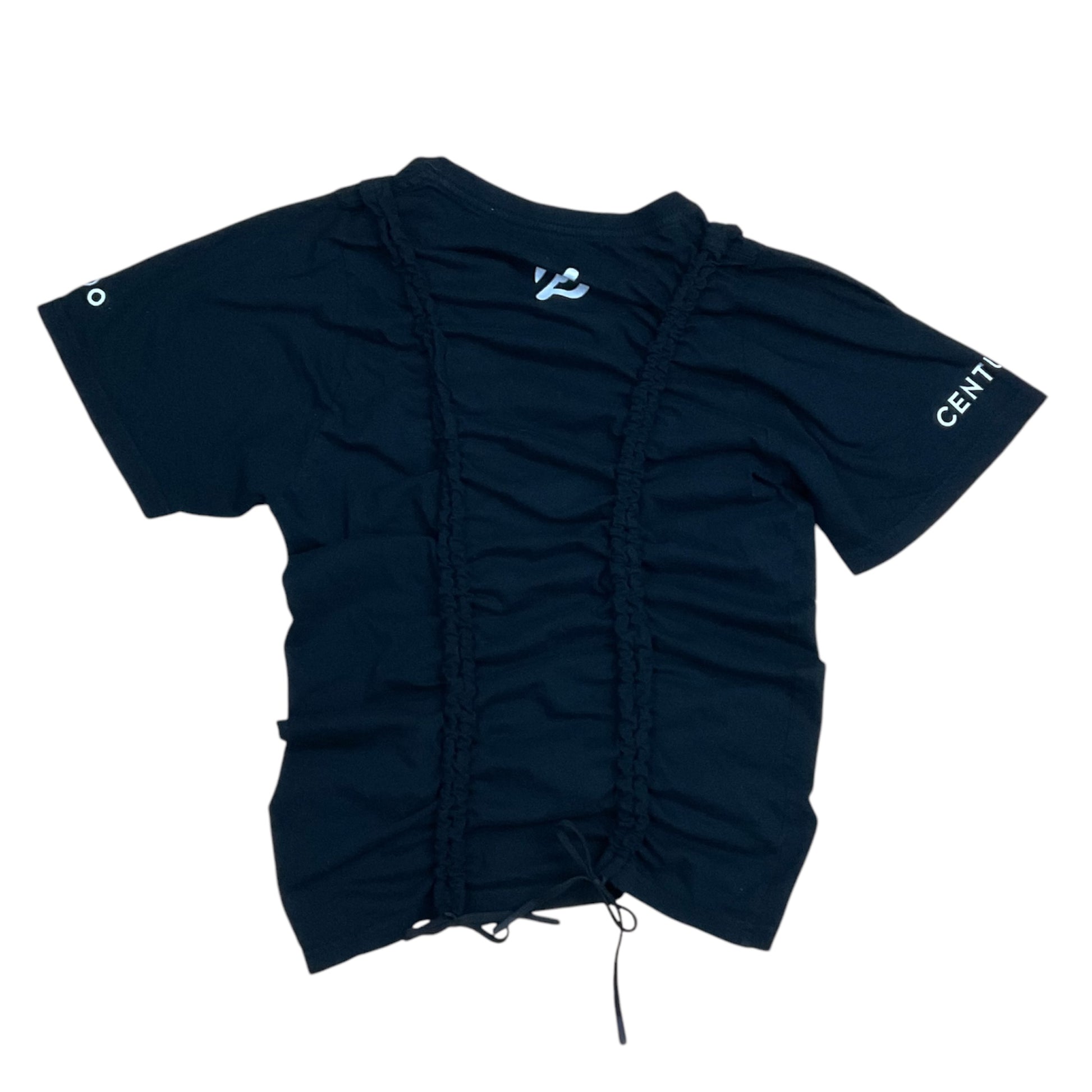 upcycled promo T shirt distorted with drawstrings down front and back. crop or uncrop as much as you wish
