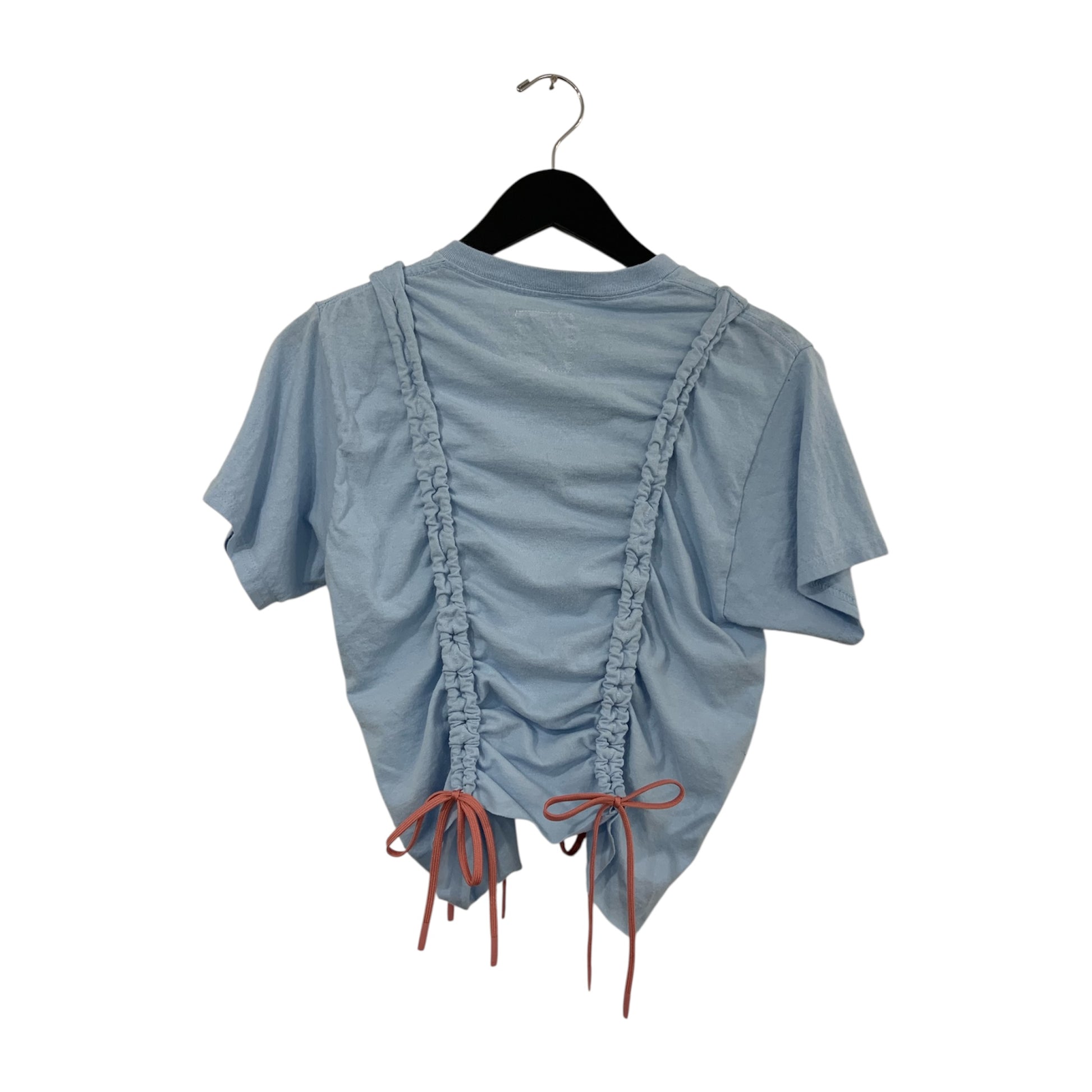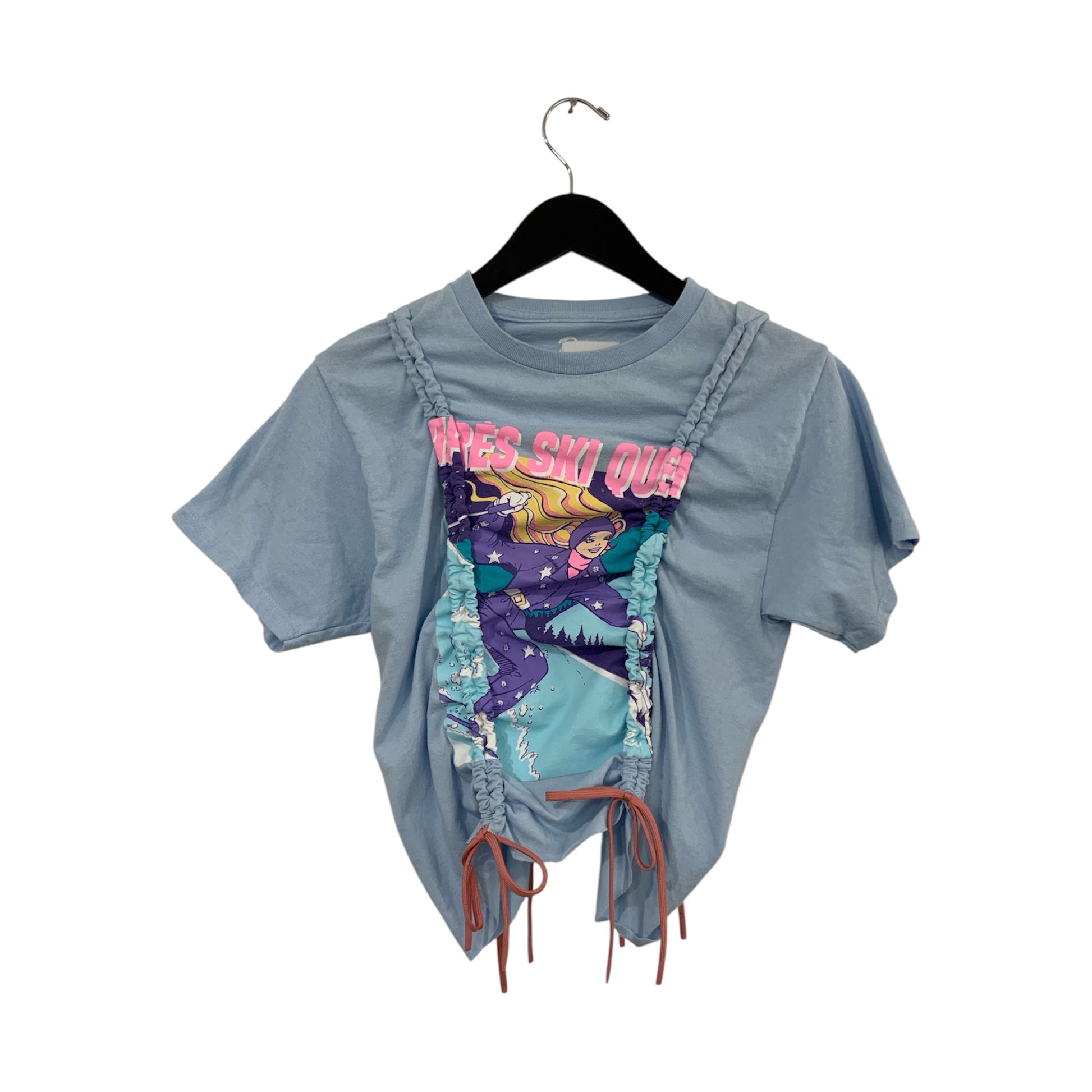 upcycled T shirt distorted with drawstrings down front and back. crop or uncrop as much as you wish