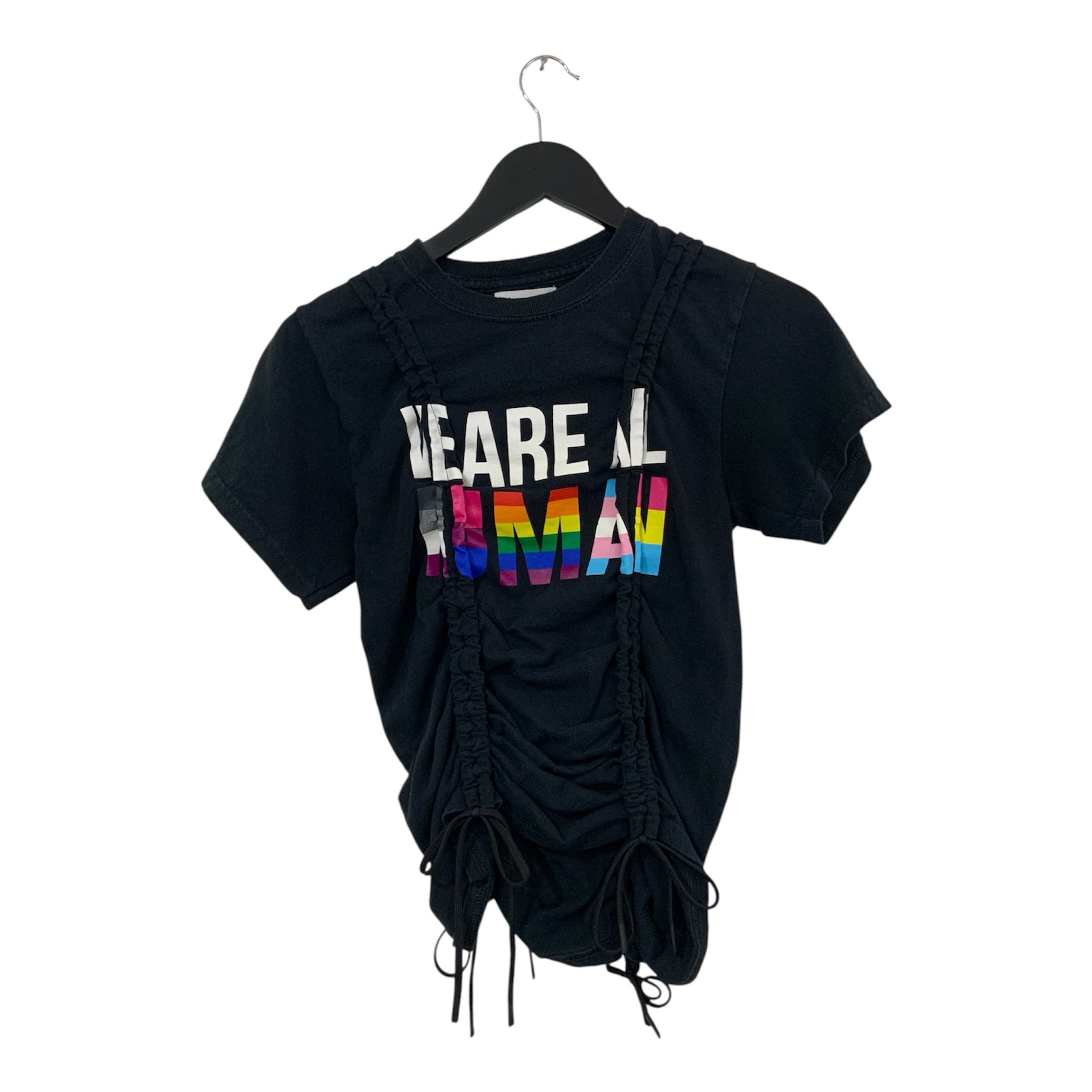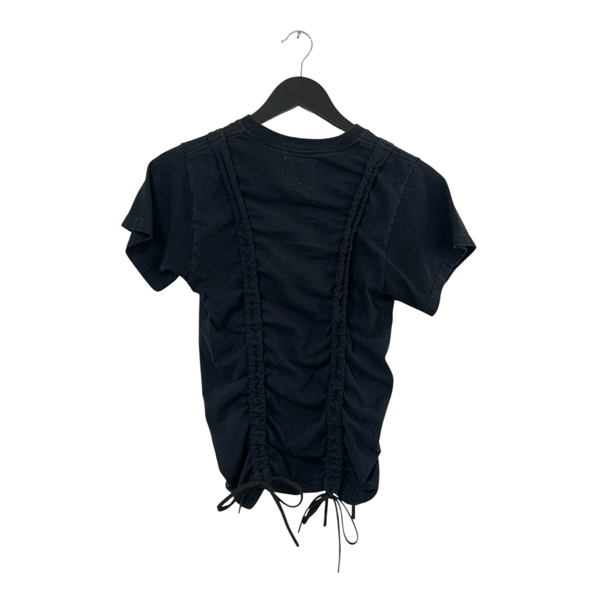 upcycled T shirt distorted with drawstrings down front and back. crop or uncrop as much as you wish