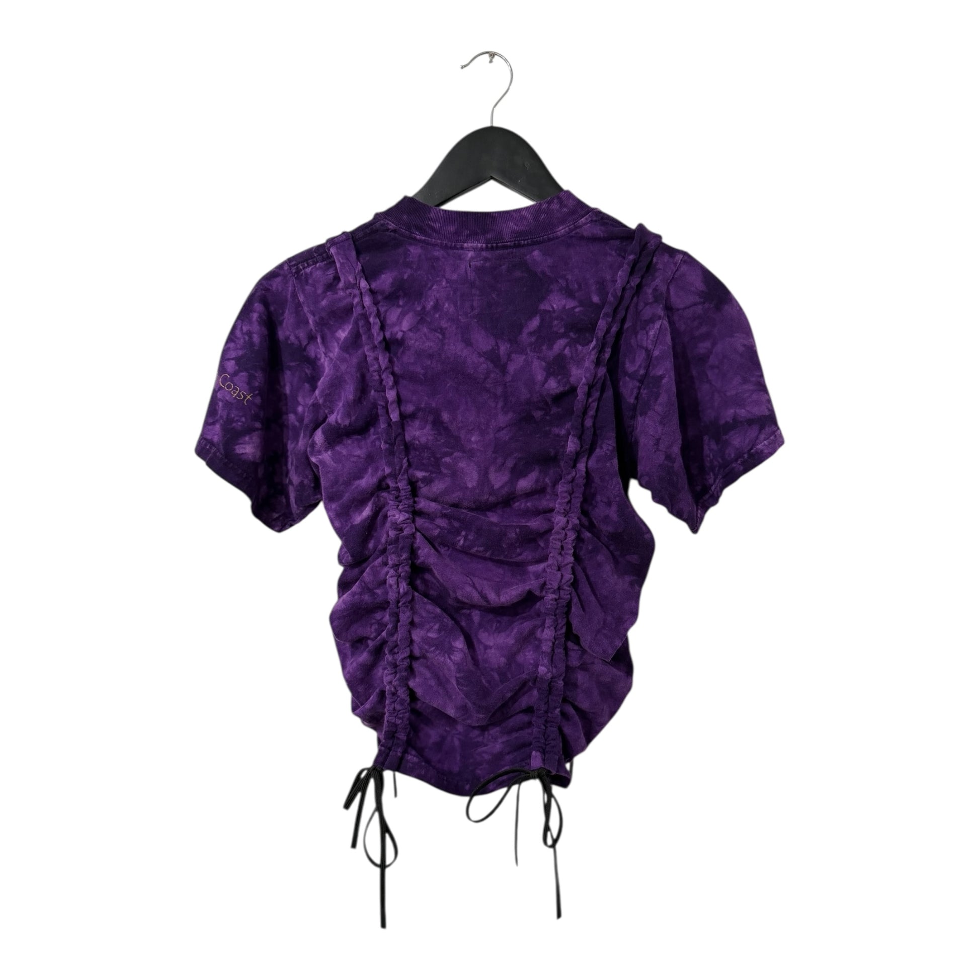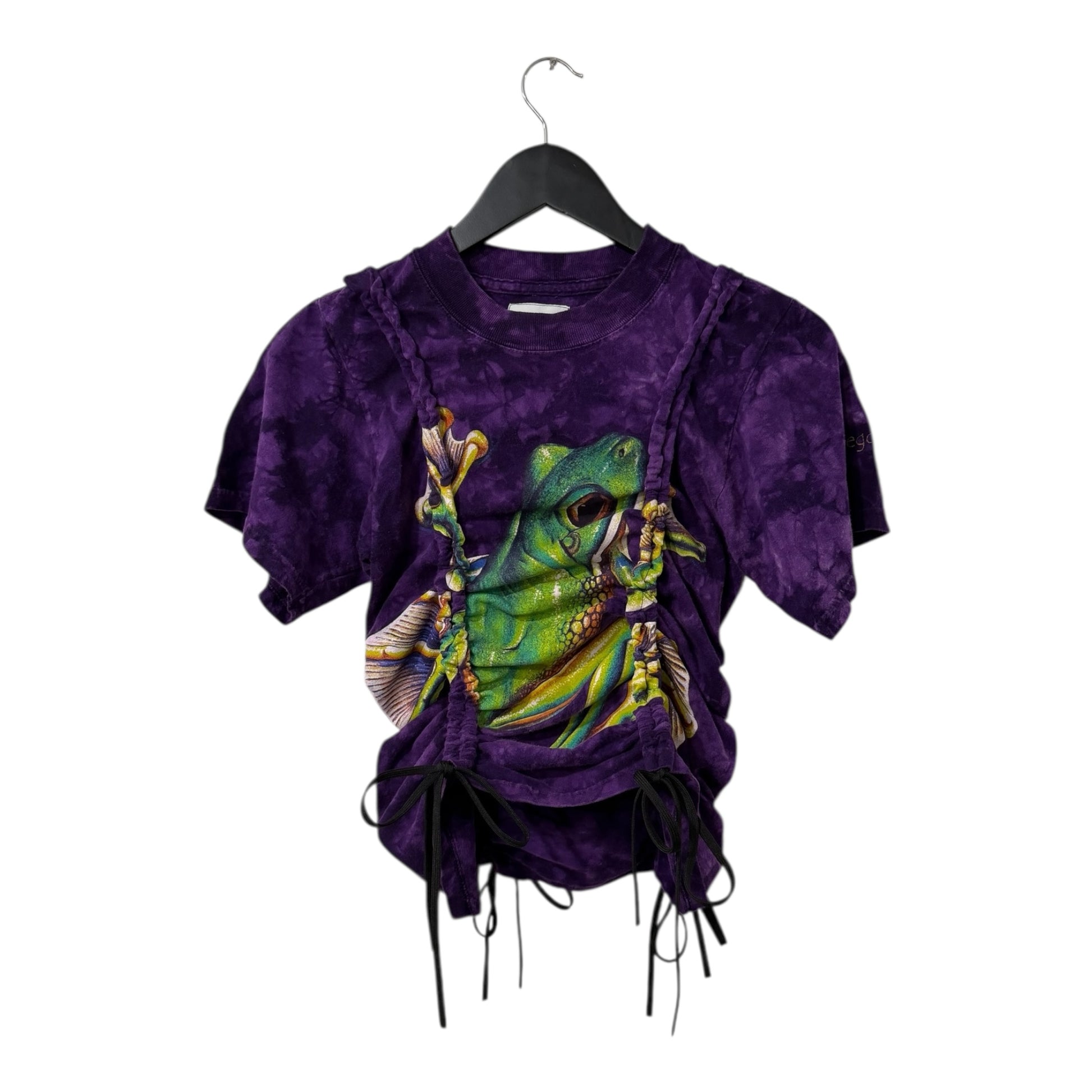 upcycled T shirt distorted with drawstrings down front and back. crop or uncrop as much as you wish