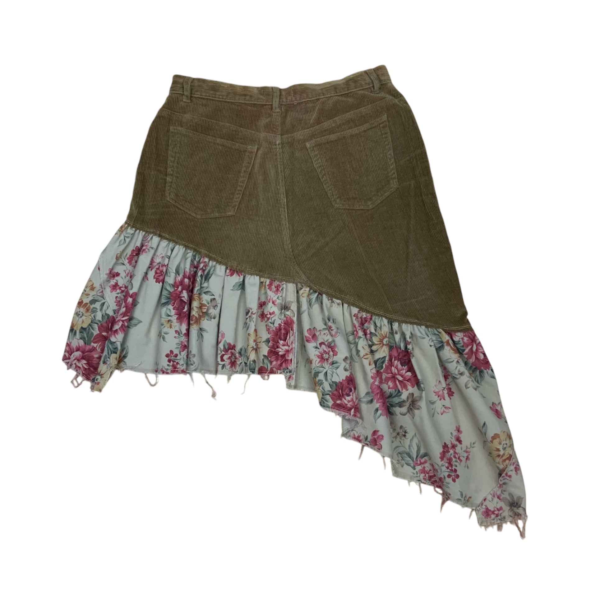 skirt made from pants. asymmetrical ruffle, raw hem, tan corduroy with floral hem