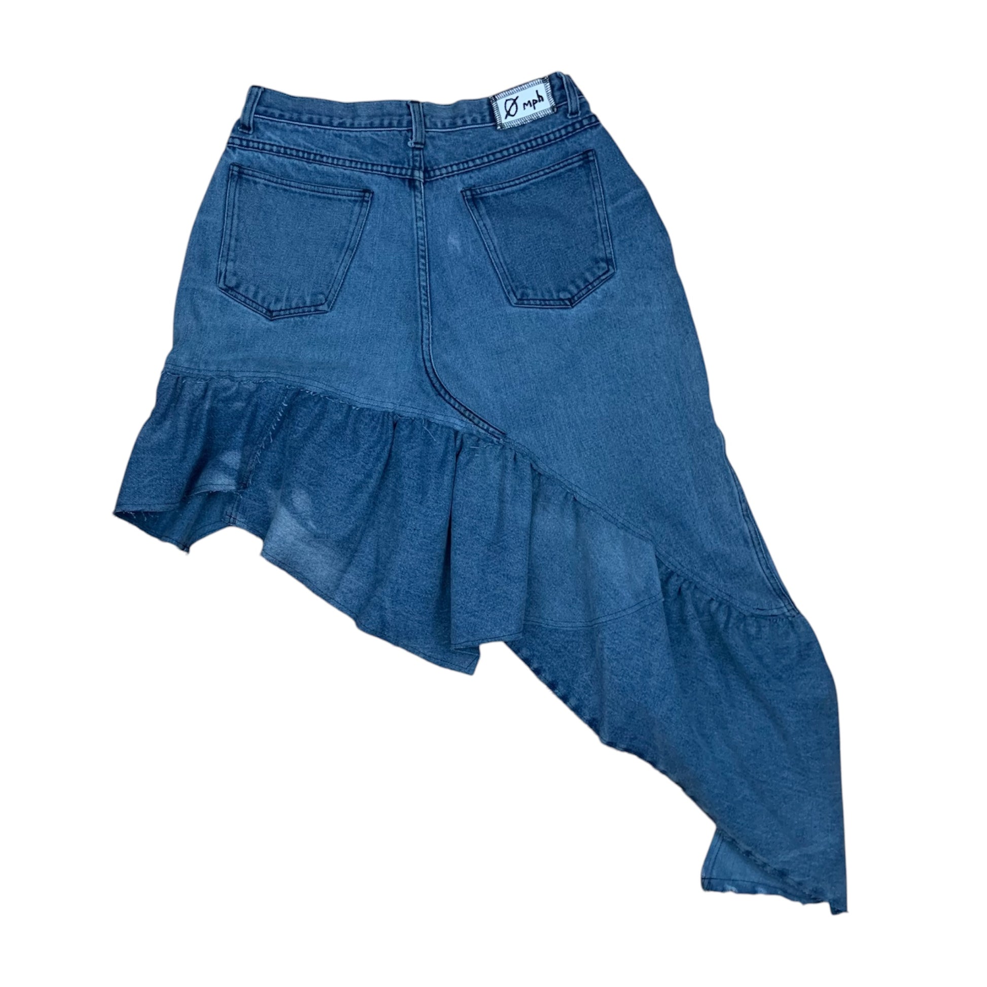 skirt made from pants. asymmetrical ruffle, raw hem, denim