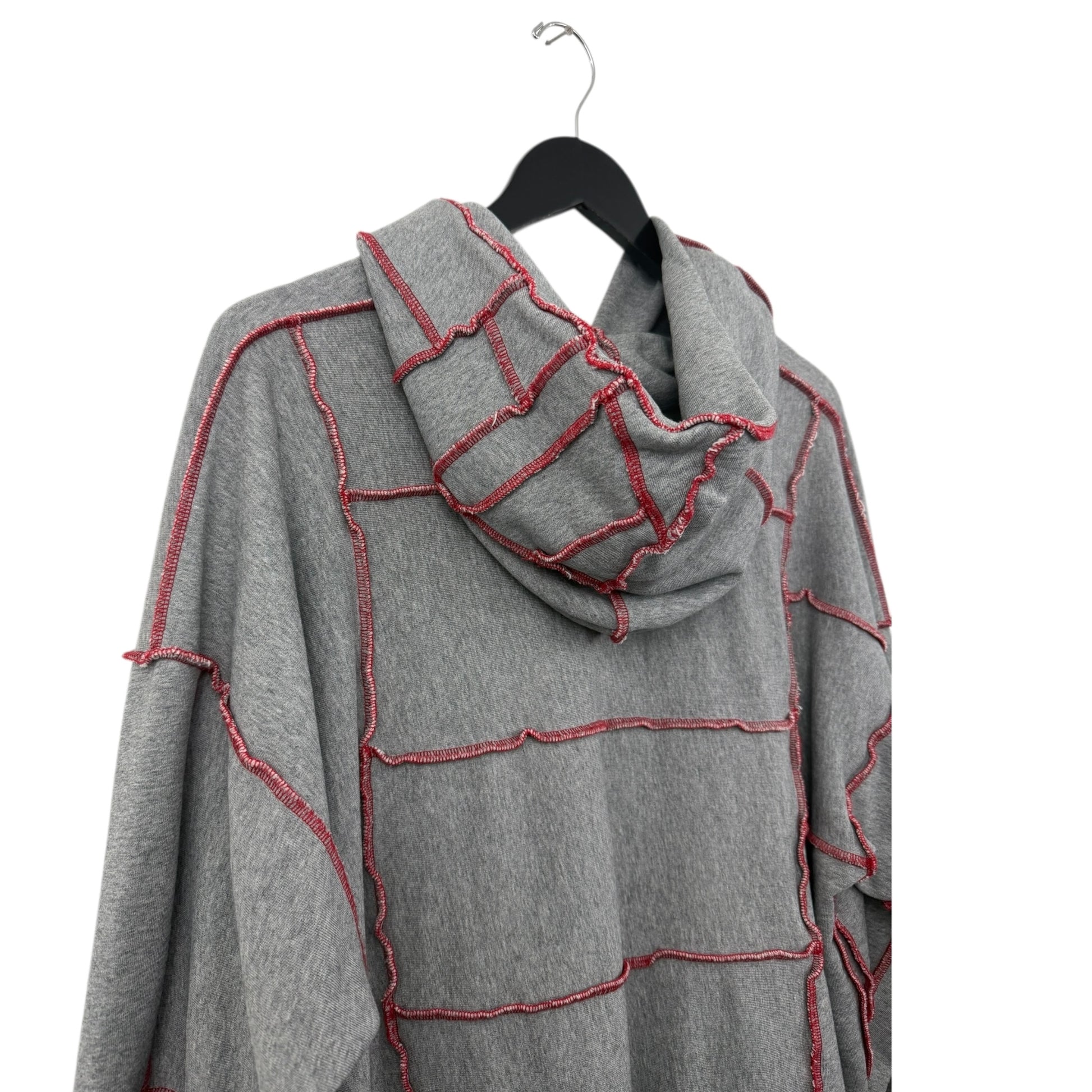 scrappy hoodie made from garment factory production offcuts. exposed red serged seams. huge pocket detail.